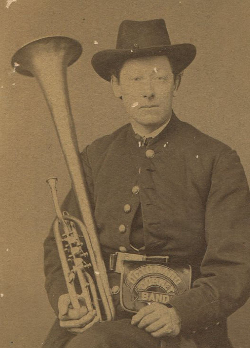 Follow this link to see photos of bands with music pouches. Please contact me if you you know of other photos that I can add to this photo gallery at Eric@HornCollector.com.